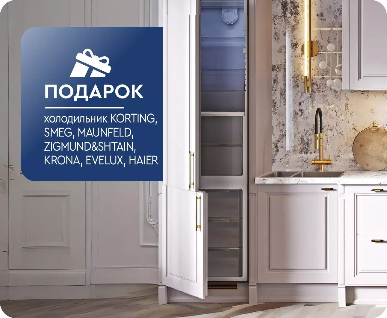 Приобретайте кухню с комплектом из 3-х и более единиц техники Haier, Smeg, Korting, Zigmund&Shtain, Maunfeld, Krona или Evelux разных товарных категорий и получите холодильник в подарок!